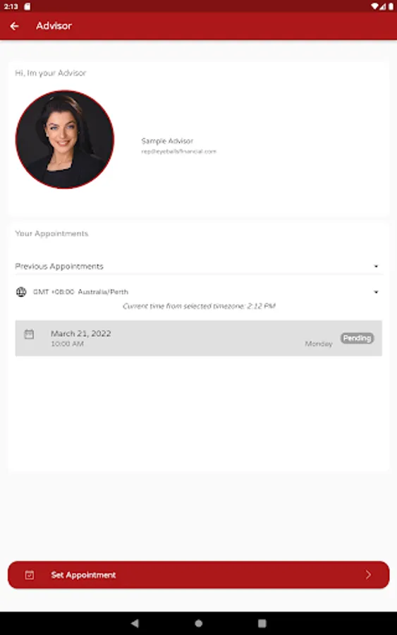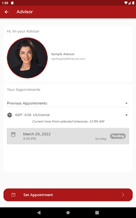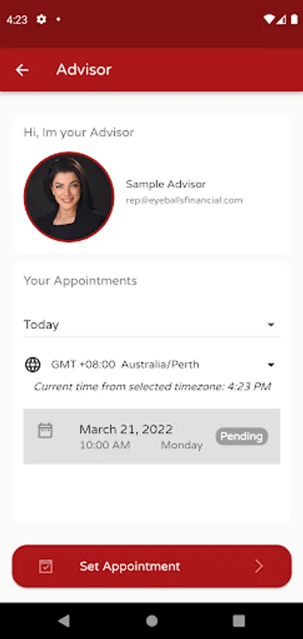The app allows clients to schedule an appointment with their financial advisor at their convenience.