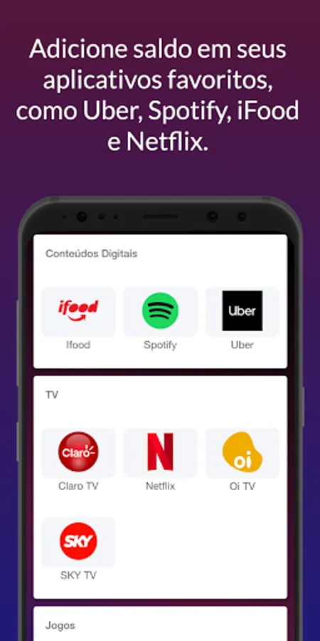 Add balance to your favorite apps like Uber, Spotify, iFood and Netflix.