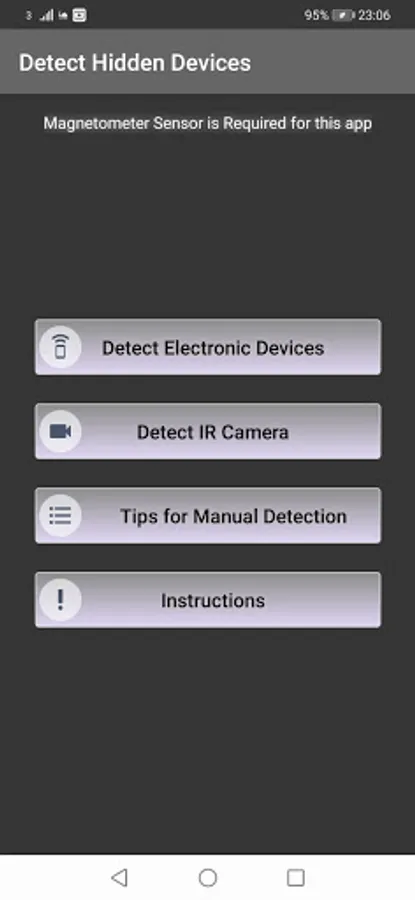 The hidden camera detector feature uses magnetometer sensor to find out magnetic value of surroundings. These readings are then calculated to find out higher magnetic field. When the magnetic field is higher than usual, the app tells user to check the nearby area for any surveillance device.