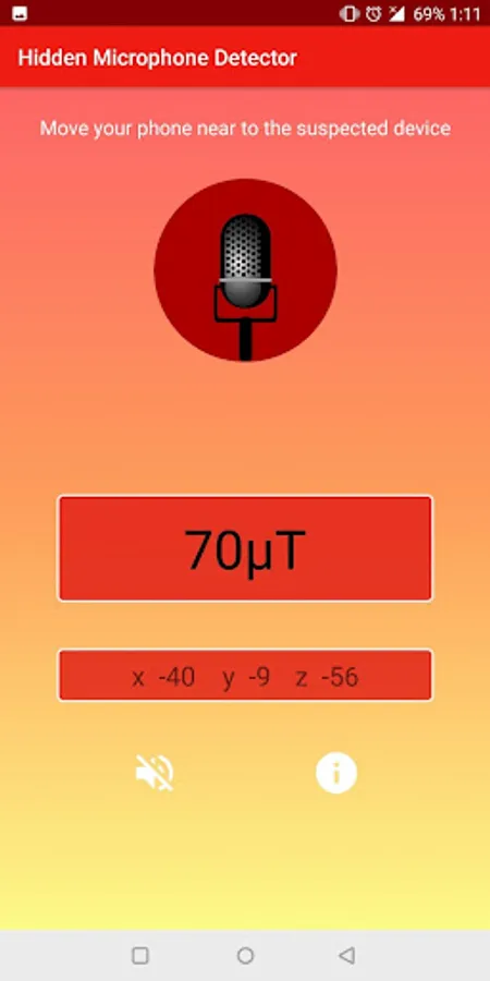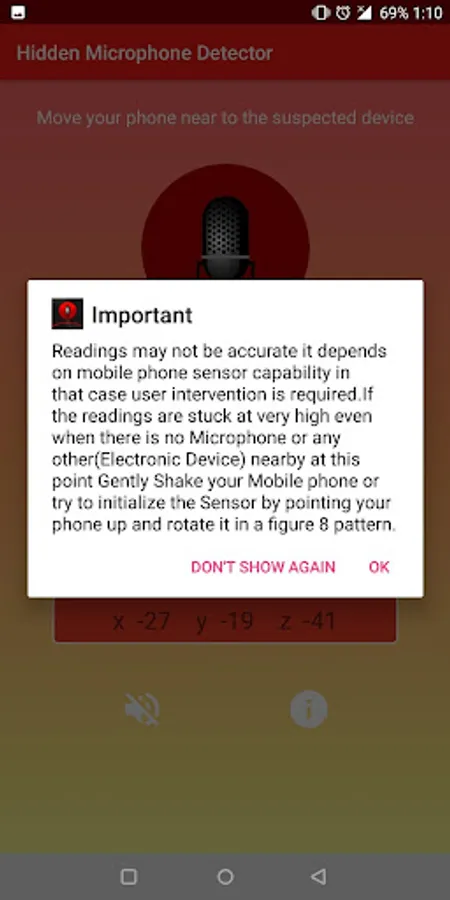 Hidden Microphone Detector application is easy to use, just open Microphone Detector app and move it around the suspected objects . If the magnetic field values arises then there should be hidden microphone or cameras in the area your surroundings.You can easily scan and detect bug easily by this detector.Accuracy of the app is entirely dependent on the magnetic sensor in your device and is affected by electronic devices such as TVs, remotes,batteries due to electromagnetic waves.