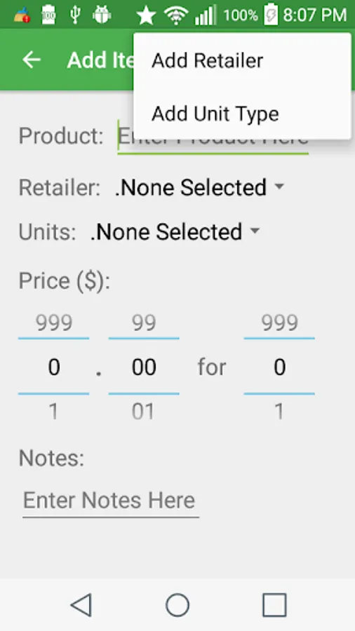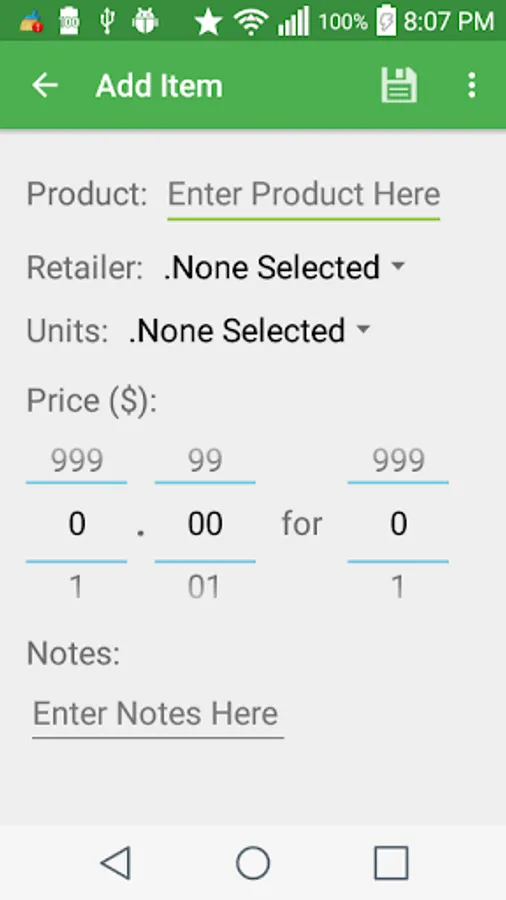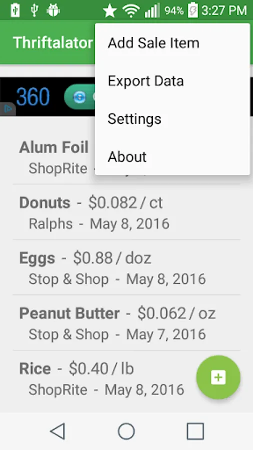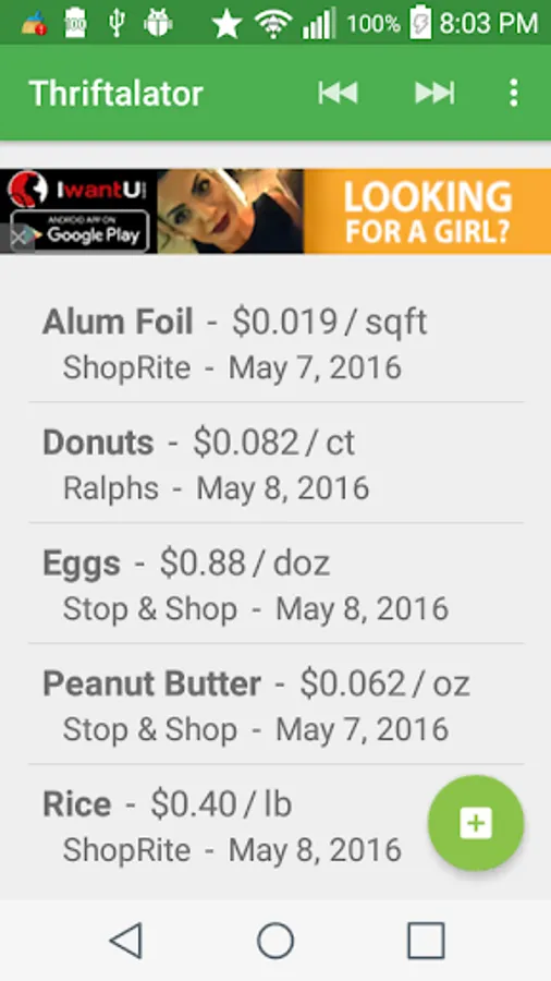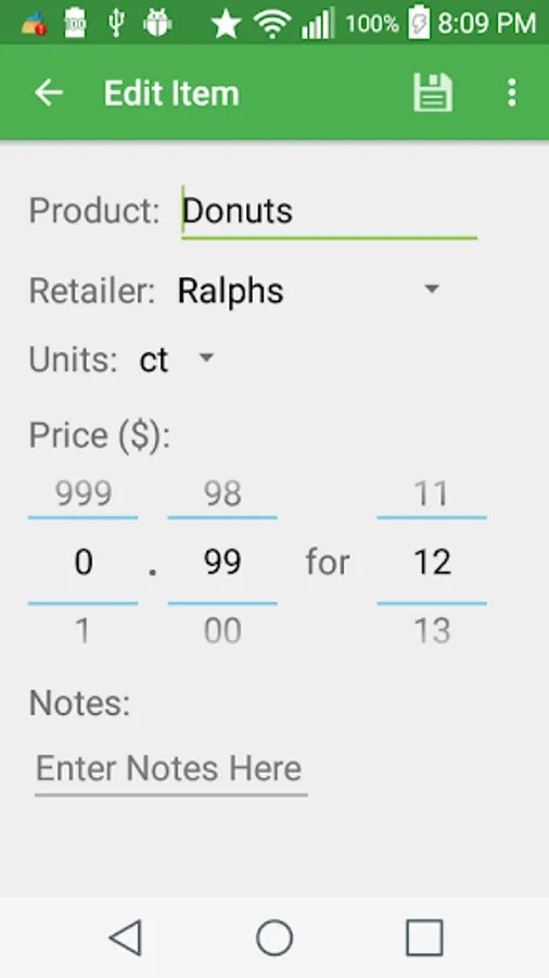 OK David, here's your grocery list app. You can enter each item you see on sale into this app along with it's price and quantity as well as the name of the store you were shopping at. The app will calculate the unit price , put a time stamp on the entry and display the information in an alphabetical list. And you can download all the stored up sale price data to a .csv file if you want to transfer the information to a spreadsheet on another machine.