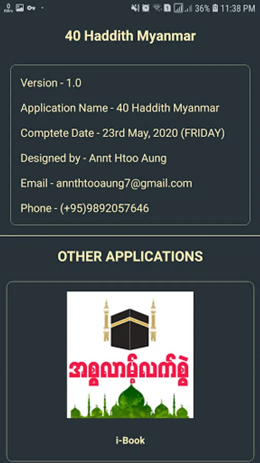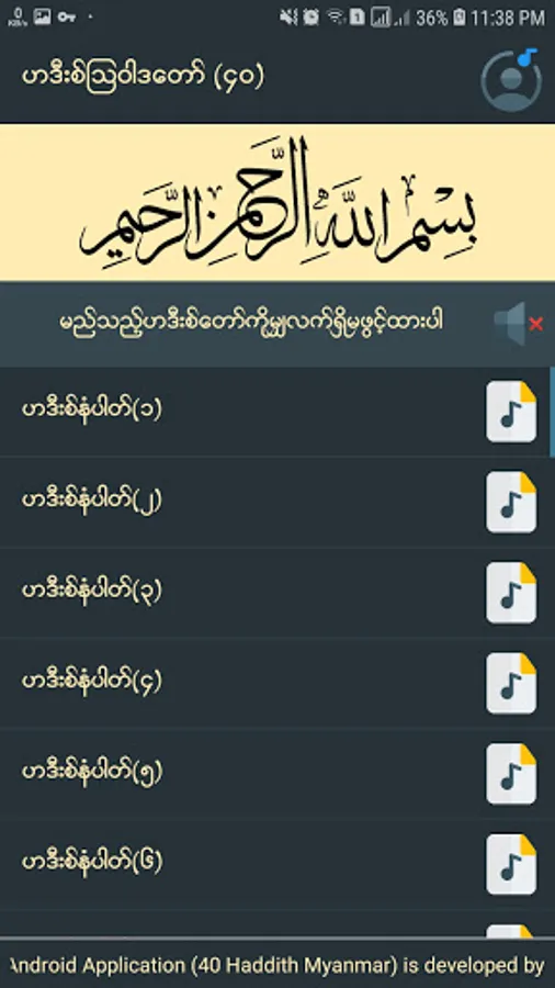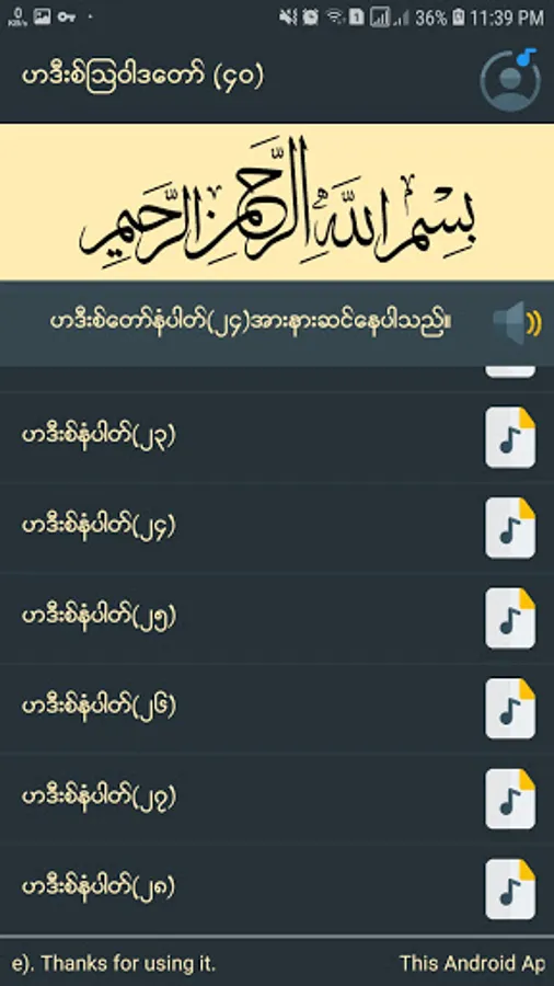 မဟာတမန်တော်မြတ်ကြီး မုဟမ္မဒ်(ဆွ)၏ ဟဒီးစ်ဩဝါဒတော်များကို Application အတွင်းထည့်သွင်းပြီး ဖြန့်ဝေပေးခြင်းဖြစ်ပါသည်။ ကလေး လူကြီးမရွေး နားထောင်ကာ (သို့မဟုတ်) ဖတ်ရှုကာ အလွတ်ကျက်မှတ် အာဂုံဆောင်နိုင်ရန် ရည်ရွယ်၍ ပြုလုပ်ထားခြင်းဖြစ်ပါသည်။ ယခုဗားရှင်း (1.0) တွင် ဟဒီးစ်တော်များ၏ အာရဗီအသံများသာ ထည့်သွင်းထားသည်ဖြစ်ပြီး နောက်လာမည့် ဗားရှင်းတွင် အာရဗီအသံ နှင့်တကွ မြန်မာဘာသာပြန် အသံကိုပါ ထည့်သွင်းပေးသွားမည်ဖြစ်ပါသည်။ ၎င်းနောက် အာရဗီစာသား နှင့် မြန်မာဘာသာပြန် စာသားကို ကြည့်ရှုဖတ်ရွတ်နိုင်ရန် ထည့်သွင်းပေးသွားပါမည်။ (အင်န်ရှာအလ္လာဟ်) အခြားသာသနာ့အကျိုးပြု Application များကိုလည်း ပြုလုပ်ဖန်တီးနိုင်ရန် မိတ်ဆွေများ၏ တောင်းဆုဒုအာများတွင် သတိရပေးကြပါရန် မေတ္တာရပ်ခံအပ်ပါသည်။ ကျွန်ုပ်နှင့် တကွ ကျွန်ုပ်၏ မိသားစု အားလုံး၊ (ကွယ်လွန်သေဆုံးသွားသူများအားလုံး) အပါအဝင် မဟာတမန်တော်မြတ်ကြီး မုဟမ္မဒ်(ဆွ)၏ အွမ္မသ် အားလုံးအား နှစ်ဘဝ နှစ်ဌာန တွင် အလ္လာဟ်အရှင်မြတ်သခင်သည် အရှင်မြတ်၏ ရဟ်မသ်ဂရုဏာတော်ဖြင့် တမန်တော်မြတ်ကြီးမုဟမ္မဒ်(ဆွ) ကို အကြောင်းခံ၍ အောင်မြင်မှု အဖြာဖြာပေးသနားတော်မူပြီး ဂျန္နသုလ် ဖိရ်ဒေါင်းစ် ချီးမြှင့်တော်မူပါစေ။ (အာမီးန်)