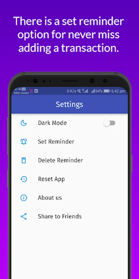 You can set reminder to never miss to add a transaction. It will notify you on scheduled time in everyday.