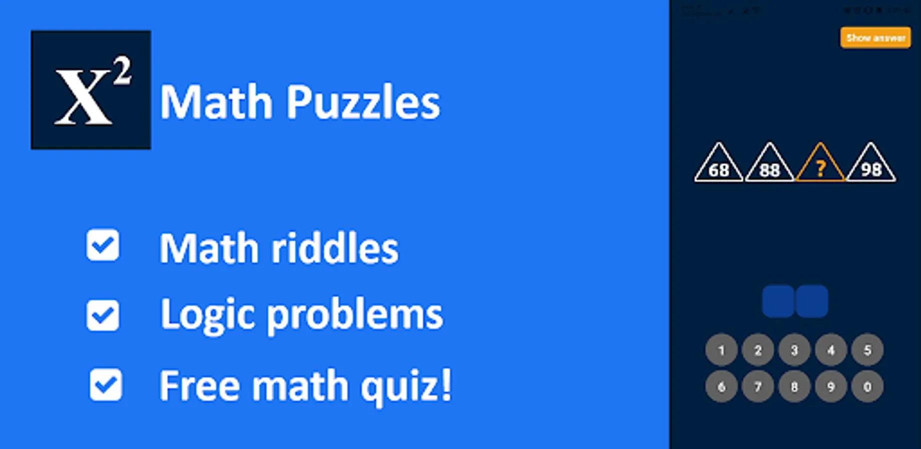 Math Puzzles is a free logic math game for adults featuring math riddles, fast math, mental math & logic quiz tasks. With Math Puzzles & Math Riddles, it is fun & easy to practice math, solve math problems & logic tasks. Math Puzzles is a free math quiz app with no extra costs hidden.
