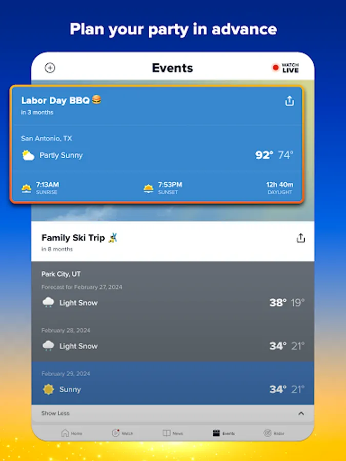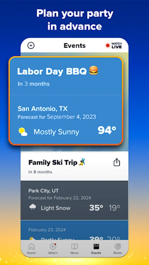 Plan your events up to nearly a year ahead with FOX FutureView, and be alerted to changes in the forecast as they happen. Be it a wedding, vacation, family reunion, or anything else you need to know the weather for, FOX FutureView can help you track & plan for it.