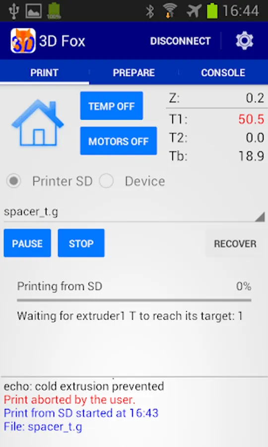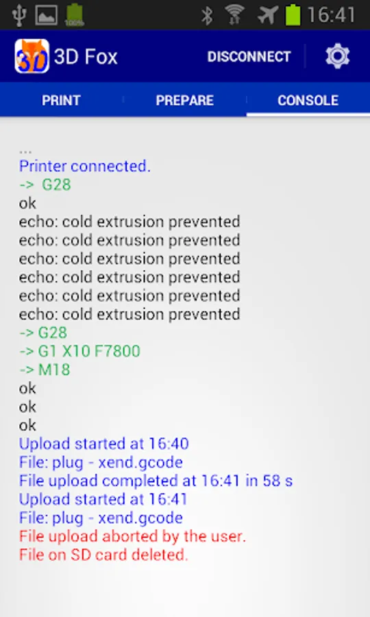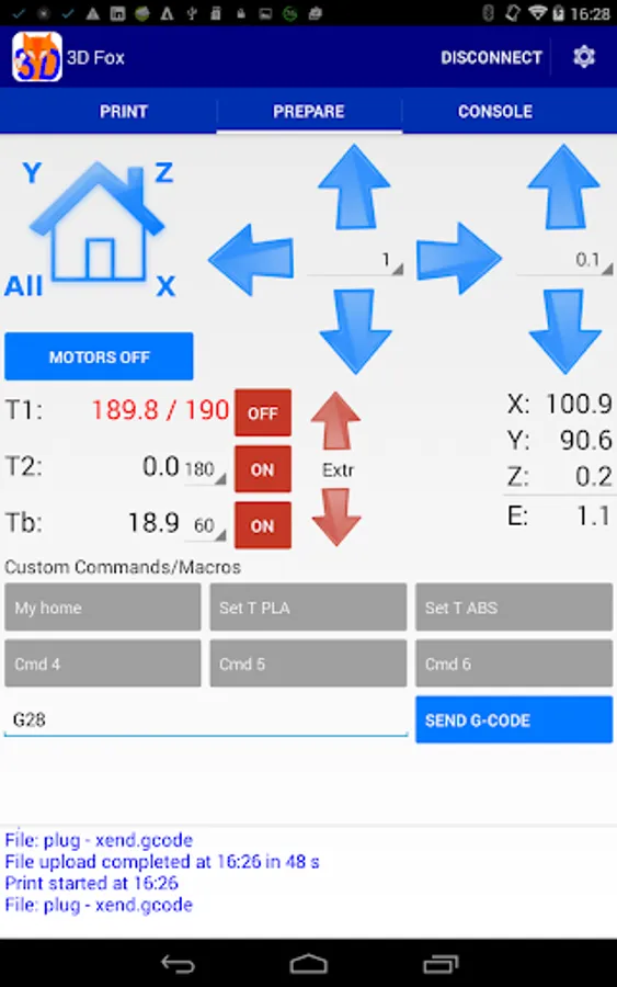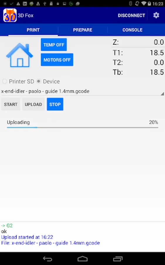 • You must put your G-code files in 3DFox directory of your Andorid device. Use a file manager (we recommend ES File Explorer) to move files from their original location to 3DFox