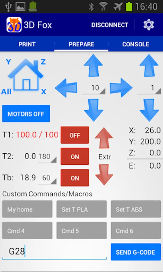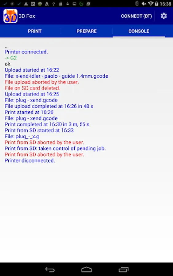 Print G-code files directly from your Android device via Wifi, Bluetooth or USB OTG/Host port.