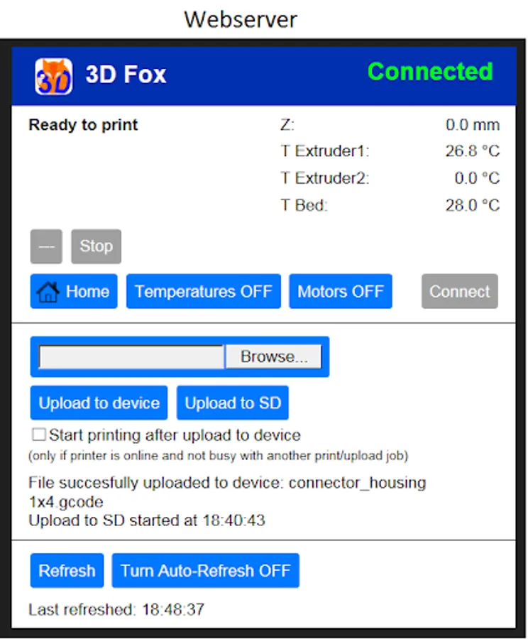 • Upload speed: 1 MB transferred in 100 s (with Mega2560+Marlin), comparable to USB connection speed.