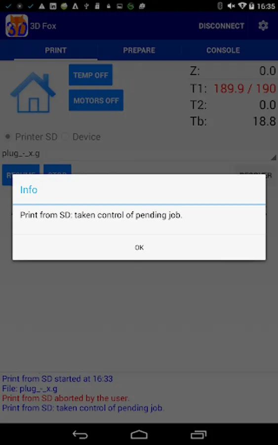 • Take back control of SD card printing jobs after losing connection with the printer. You can use this feature to manager several printers with the same device: start a print job on printer A, then do something else on printer B, finally go back to printer A and take back control of the pending printing job.