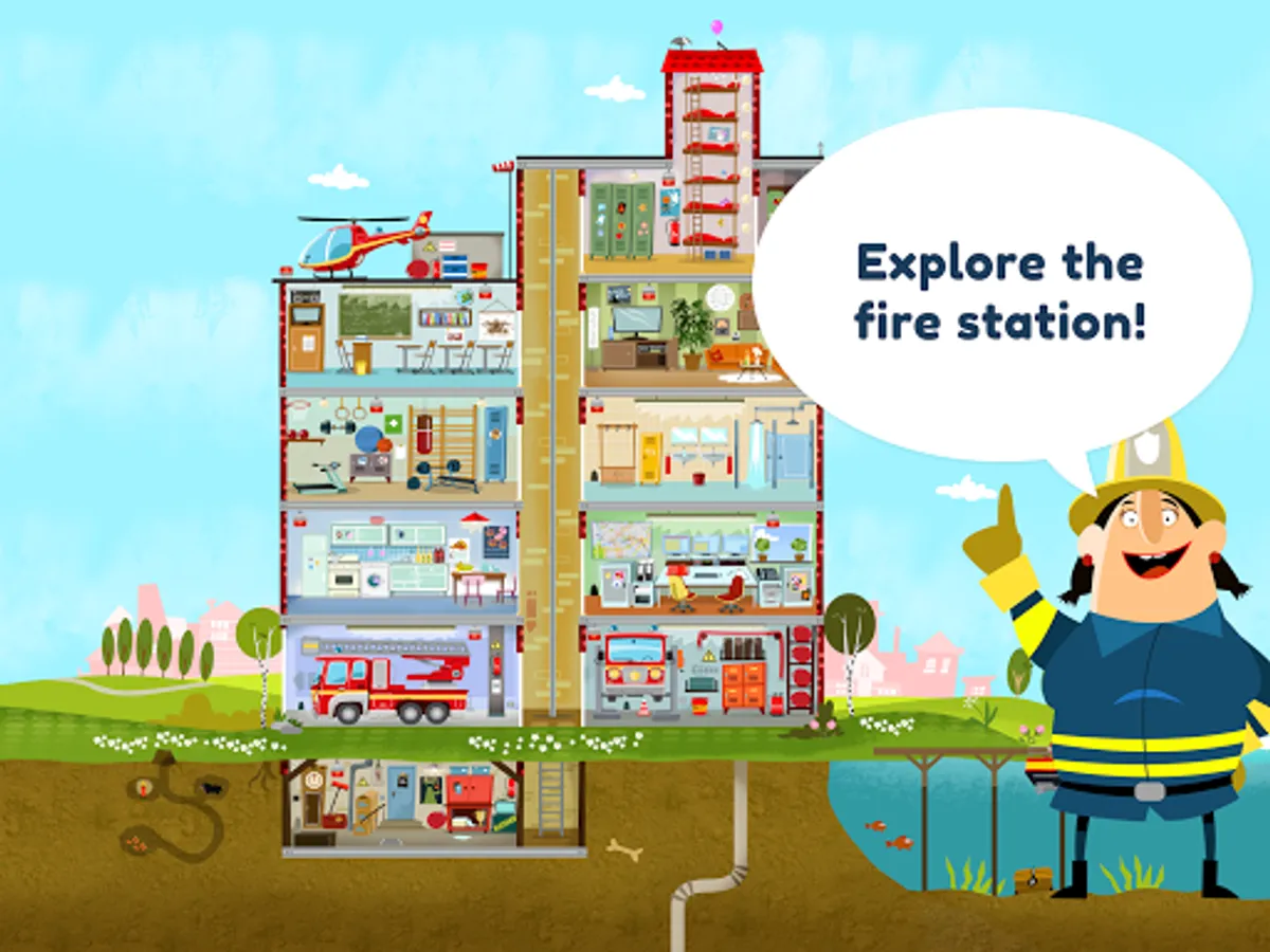 Help the little fire fighters to go on missions to extinguish a fire, save an animal or to experience many other adventures! But it's not only about the missions - enjoy the daily routine of our little fire fighters: Explore the fire station and interact with the objects, animals and firefighters in each room.
