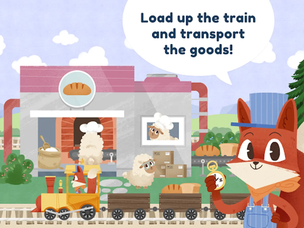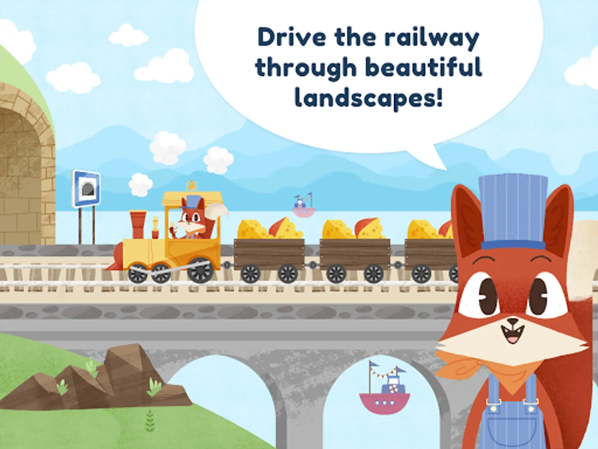 In "Little Fox Train Adventures", children can travel by train through enchanting landscapes and visit various places. At farms and factories, they help to load and unload the wagons, produce goods and deliver them to the next city. Lovely illustrations, fun animations and simple controls make the app suitable even for little children.