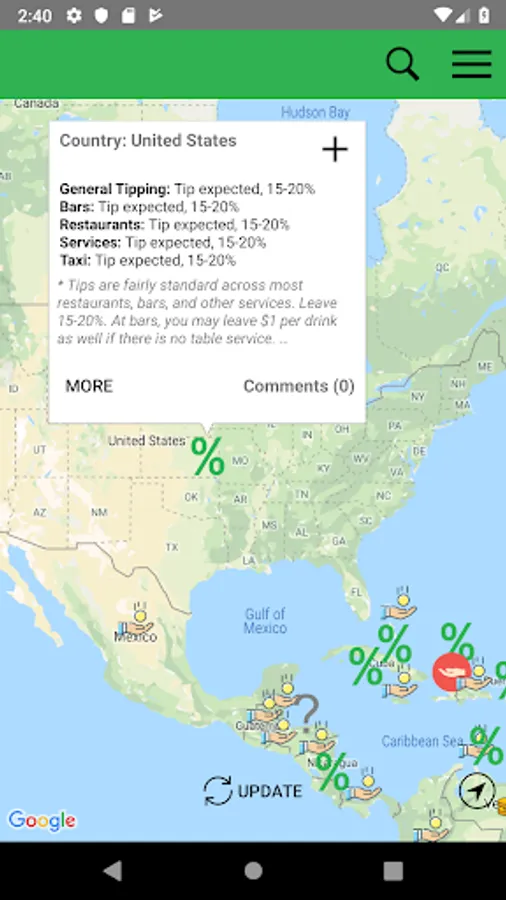 * TipFox shows you whether or not tips are generally expected, rounded up, not common, or just used in certain circumstances, all at a quick glance on map view.