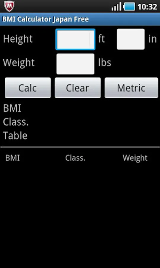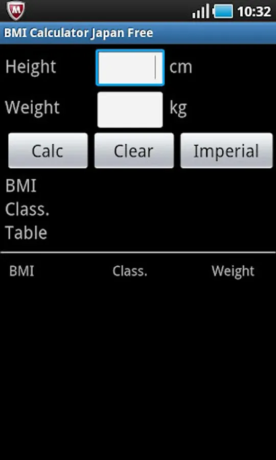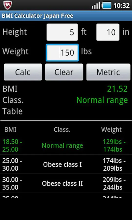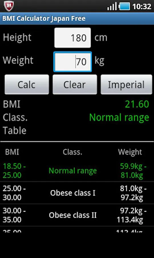 - If you press Calc button after the height and weight is entered, BMI, obesity classification, and obesity classification table are displayed.