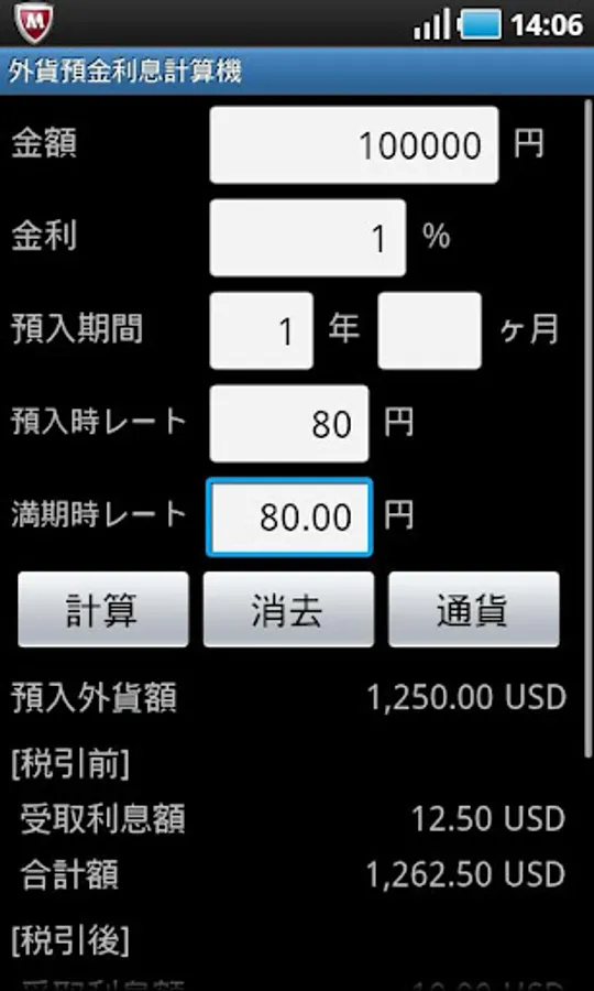 And foreign currency deposit interest calculator, amount, interest rate, deposit period, deposit at the rate, from maturity rate, is an application to calculate the interest amount of foreign currency deposits.