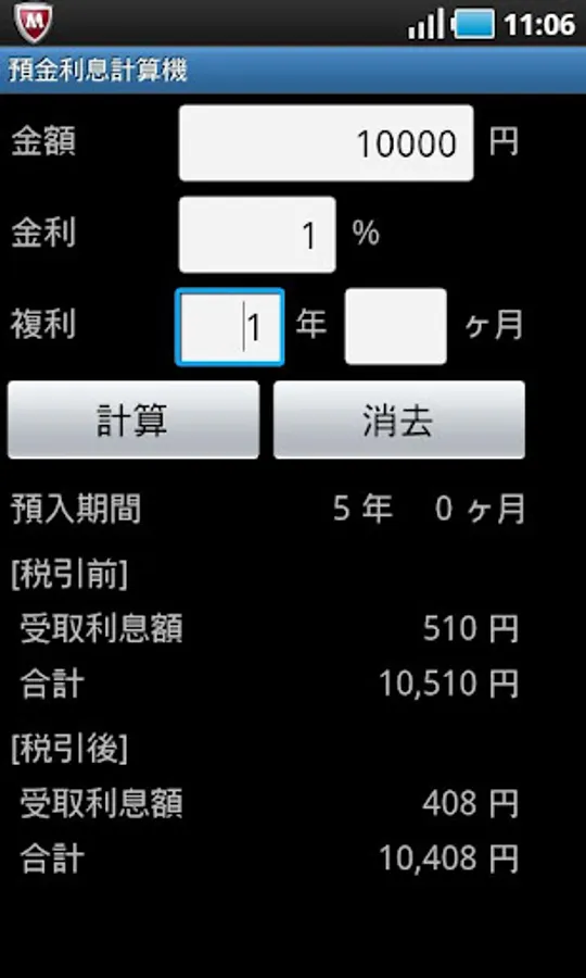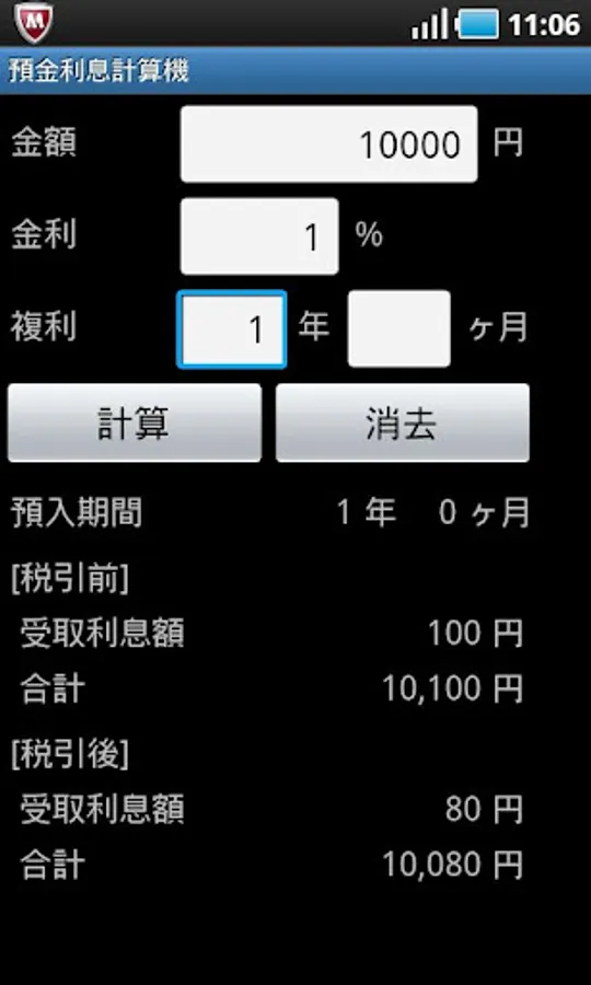 - Enter the amount, interest rate, the deposit period, pressing the Calculate button, interest income amount of pre-tax and after-tax, total (value obtained by adding the amount of money that has been input to receive interest amount) is displayed.