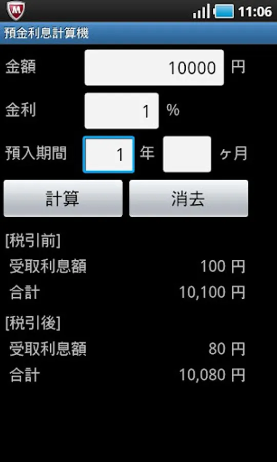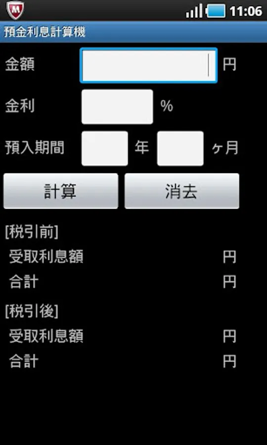- Interest income amount, the total display after, each time you press the calculate button, interest income amount of after-tax and pre-tax deposit term (compound interest × calculation button press times as = input), the total will be displayed.