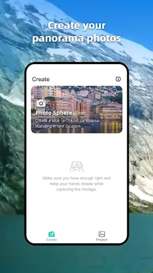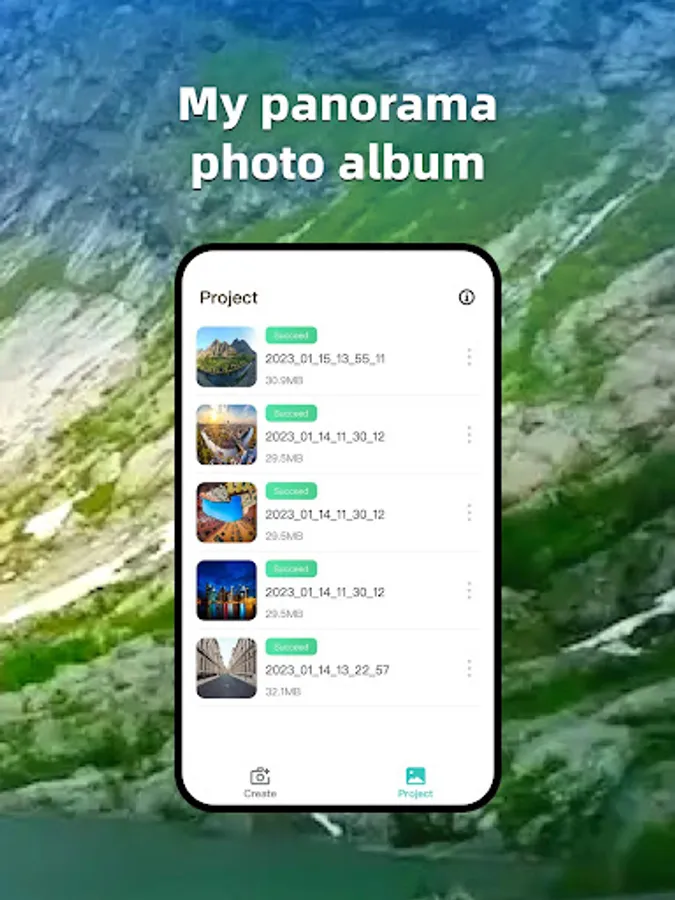 Easily create seamless panoramas with just a few seconds of tap. Just go to "Create", hit the "Capture" button, and move the phone slowly and steadily from left to right. After capture is complete, the frames are automatically stitched into one awesome panorama.