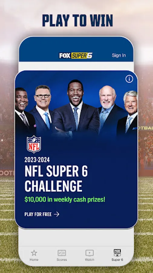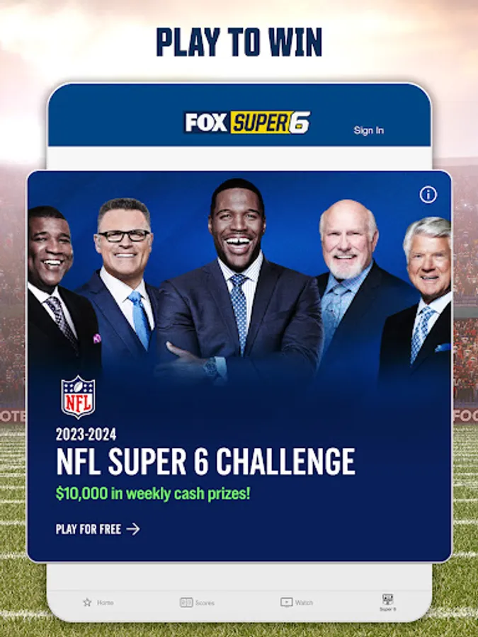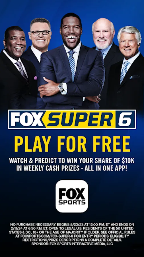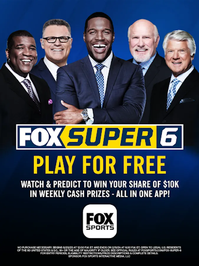 *NO PURCHASE NECESSARY. Begins 8/23/23 at 12:00 p.m. ET and ends on 2/11/24 at 6:30 p.m. ET. Open to legal U.S. residents of the 50 United States & D.C., 18+ or the age of majority if older. See Official Rules at https://www.foxsports.com/fox-super-6 for entry periods, eligibility restrictions/prize descriptions & complete details. Sponsor: FOX Sports Interactive Media, LLC.