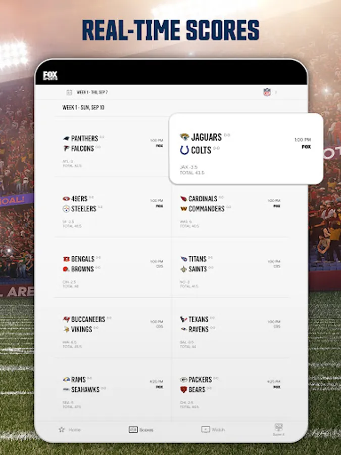 It’s game on with the FOX Sports App! Designed for sports lovers everywhere, you can stay connected to your favorite teams and games—from the NFL and college football to MLB, NASCAR and more—with live matches and real-time scores. You can also read top stories, view betting odds, receive customized alerts, and much more on the FOX Sports mobile app! Download the FOX Sports App or visit FOXSports.com.
