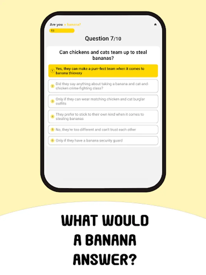 Of course, the app isn't just limited to bananas - maybe you're secretly an avocado, or even a chicken. Who knows? The "Are you a banana?" app will help you unlock the secrets of your true nature, and give you a laugh in the process (in a very human way, of course).