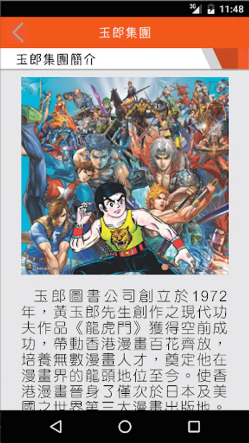 Yuk Book Company, founded in 1972, works of modern kung fu Mr. Huang Yulang Creation "Dragon Tiger Gate" was an unqualified success, led Hong Kong comics flourishing, training countless comic talent, and laid his leading position in the comic industry today. Hong Kong Comics joined the world after Japan and the United States the third largest comic publication.