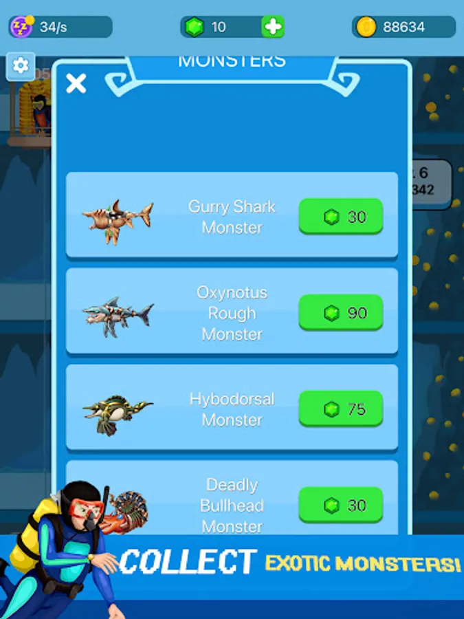 You can get your pet underwater sea monsters to work, collect golds and build your virtual world of ocean monster species. Collect different species, make them bigger and stronger to go to battle.