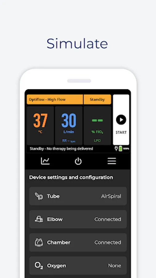 You can change settings, change oxygen configuration and FiO2 percentage, view data and graphs, and simulate warnings.
