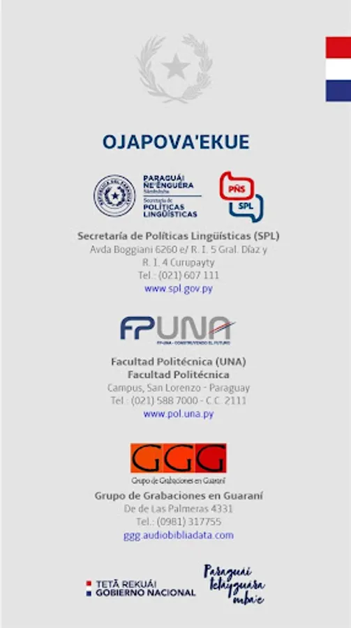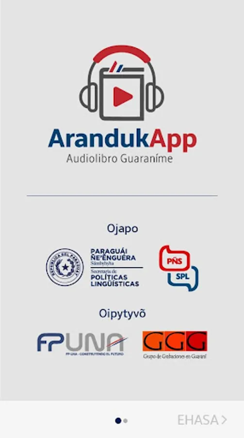 The Secretariat for Language Policies (SPL), with the support of the Group of Recordings in Guaraní (GGG) and the Polytechnic Faculty of the National University of Asuncion (FPUNA), developed the APP "ArandukApp" (audiobooks in the Guaraní language). The application contains audios of different types of texts recorded mostly by the same authors.