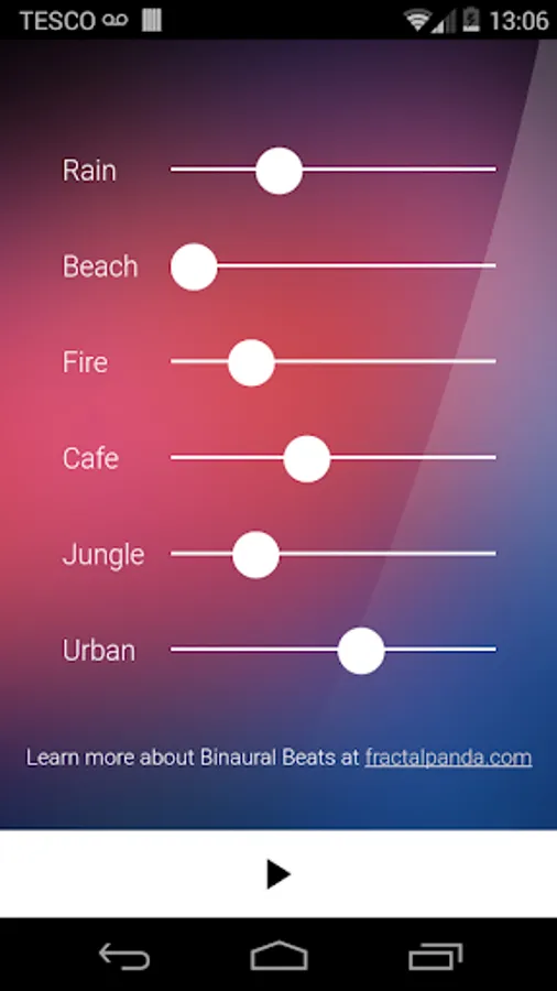 Simply select your binaural beat frequency and the base frequency that you want the tone, put on some headphones, and hit play. You can mix in up to 6 sound effects by scrolling down and adjusting the volume for each effect. You can learn more about binaural beats and the effects of the frequencies at http://fractalpanda.com