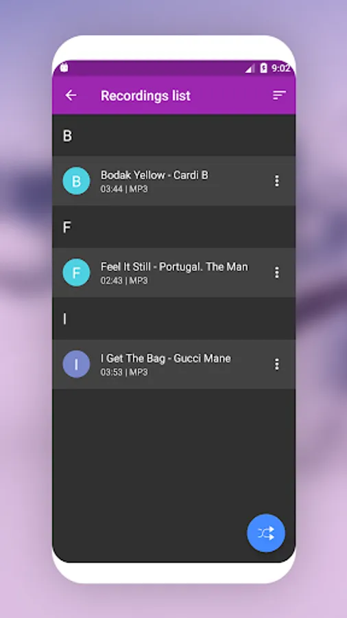 - Arrange recording file in time order, name of recording file, sound format or length of recording file