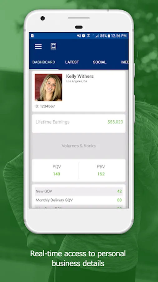 Dashboard: Gives you a snapshot of your business details such as your name and location, your current rank, your Sponsor, and percentage to next rank in a progress bar. It also provides step-by-step guidance to show you what you need to do to grow your business.