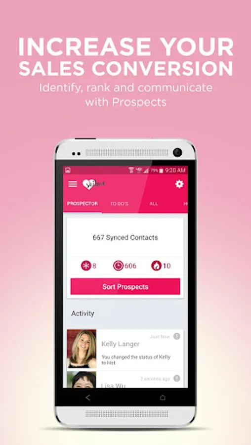 ★ Prospector Utilizing a “swipe-to-sort” format, identify leads with a game-like interface. You will be presented with each contact, one at a time, to sort for potential customers or recruits. Contact prospects, make notes, and schedule follow-ups, all while each interaction is automatically tracked for you.