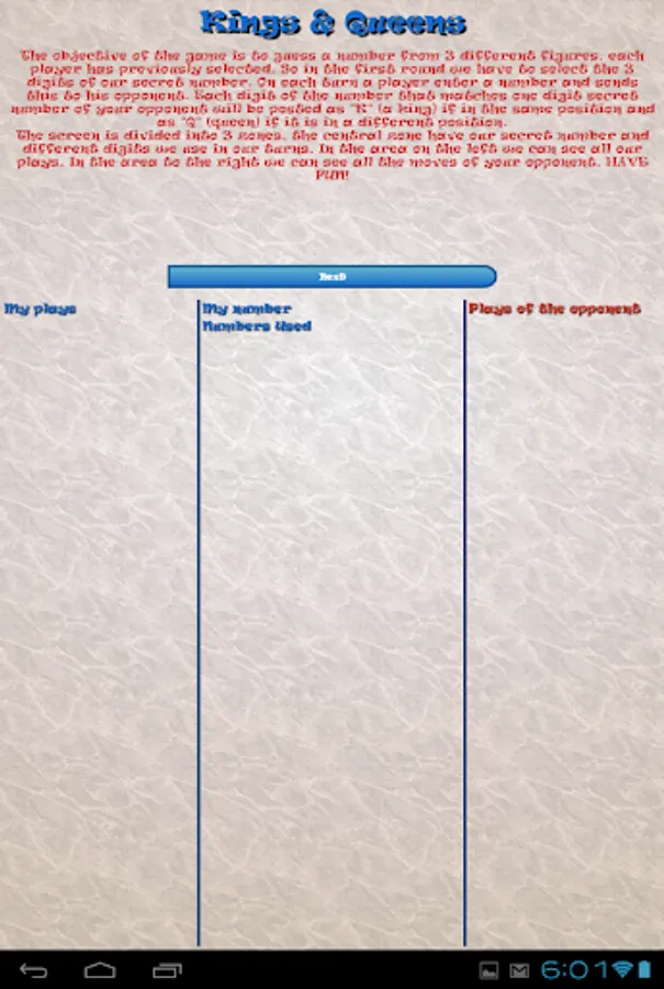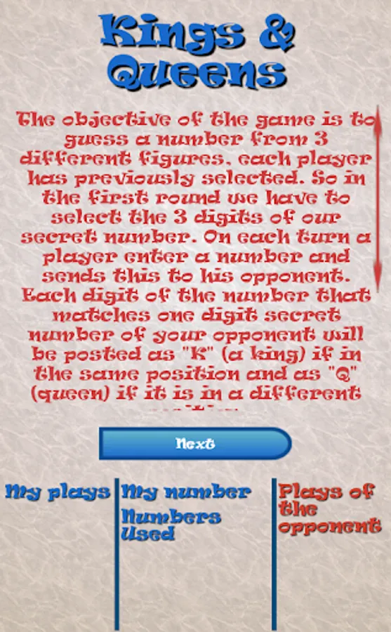 The challenge we can compete with our friends to the game of "Kings & Queens" . Each player must guess the number of his opponent , to do each turn a player enter a 3-digit number each digit different from each other. In each run we can check how many digits "K" will guess right if you are in position and pampers "Q" if it is in a different position .