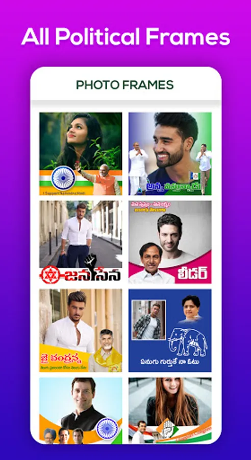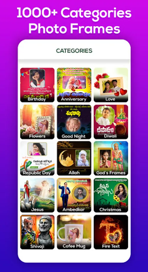 Framy App Updates All Festivals Photo Frames in Local Languages, Telugu Photo Frames also available, Tamil All trending Photo Frames, hindi Photo Frames, and also Kannada Photo Frames Available.
