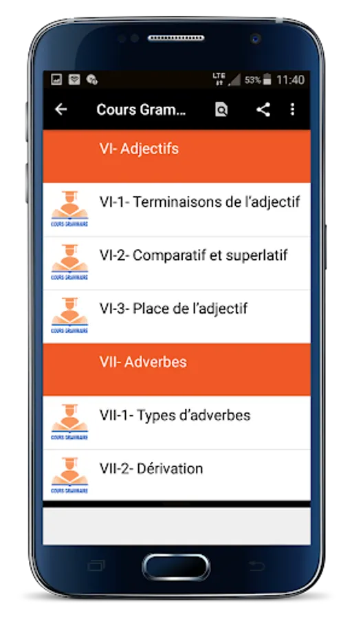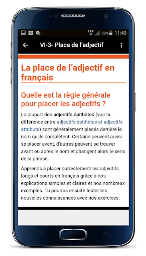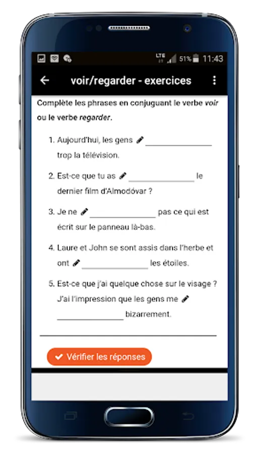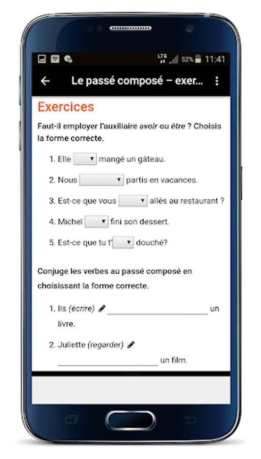 With our "Grammar, Vocabulary and Conjugation with Exercises" application, you can improve your French in an interactive and fun way. This book is intended for students of all levels, teenagers or adults, and can be used in class or independently. With more than 169 lessons and 170 corrected exercises, you can improve your spelling, your grammar and discover new words in French. In addition, our conjugator includes more than 7500 verbs and allows you to conjugate all French verbs independently, even without an Internet connection. Choose our application to improve your French in an effective and fun way!