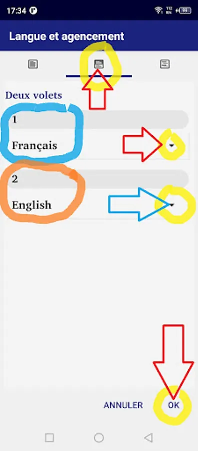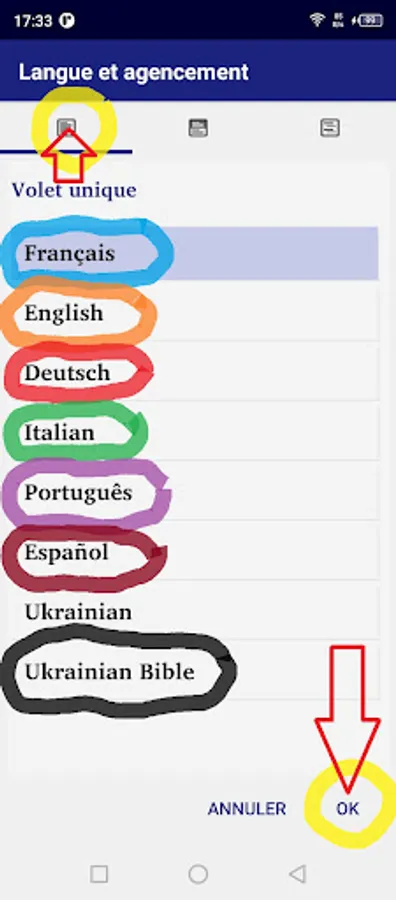 - «deux volets» pour afficher le Français en haut et parallèlement la version anglais ou allemand ou italien, ou português, ou espagnol, ou ukrainien en bas