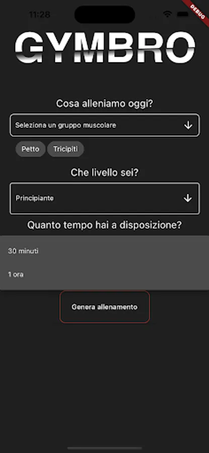Available time: Indicate the amount of time you have available for training, choosing between two options: 30 minutes or 1 hour. Gymbro will optimize your workout plan so you can make the most of the time you have, giving you a balanced and complete workout plan, no matter how long you choose.