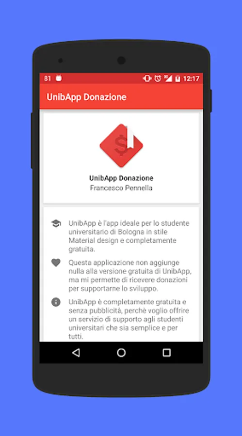 This app doesn't add anything to free version of UnibApp, but allows me to receive donations to support its development. UnibApp is completely free and without ads, because I want to provide a support service for university students of Bologna that is simple and available for everyone.