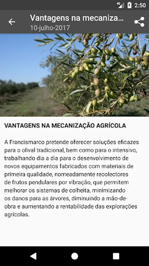 FrancisMarco manufactures and markets a wide range of products, of high and recognized quality, which compete in the most demanding markets in the agricultural sector, namely Fruit Trimmers and Vibration Pendular Fruit Collectors (olives, almonds, pine nuts, pistachios, etc.) different characteristics, adapted to the needs of each client.