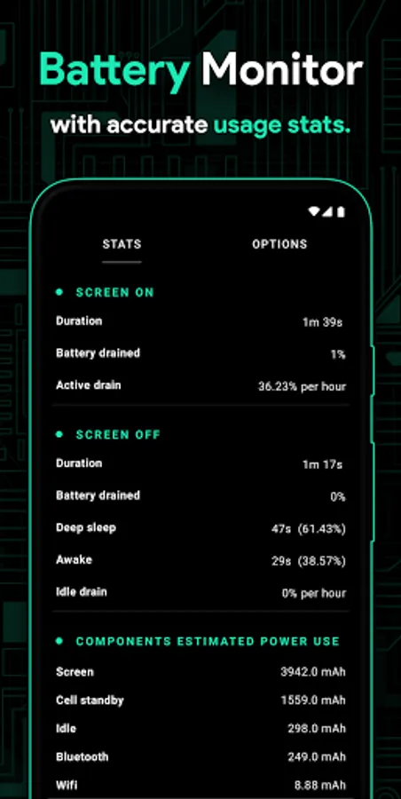 ⭐️ Detailed battery stats with information about power consumption in mAh of each component (WiFi, screen, signal, idle, etc) and tons more;