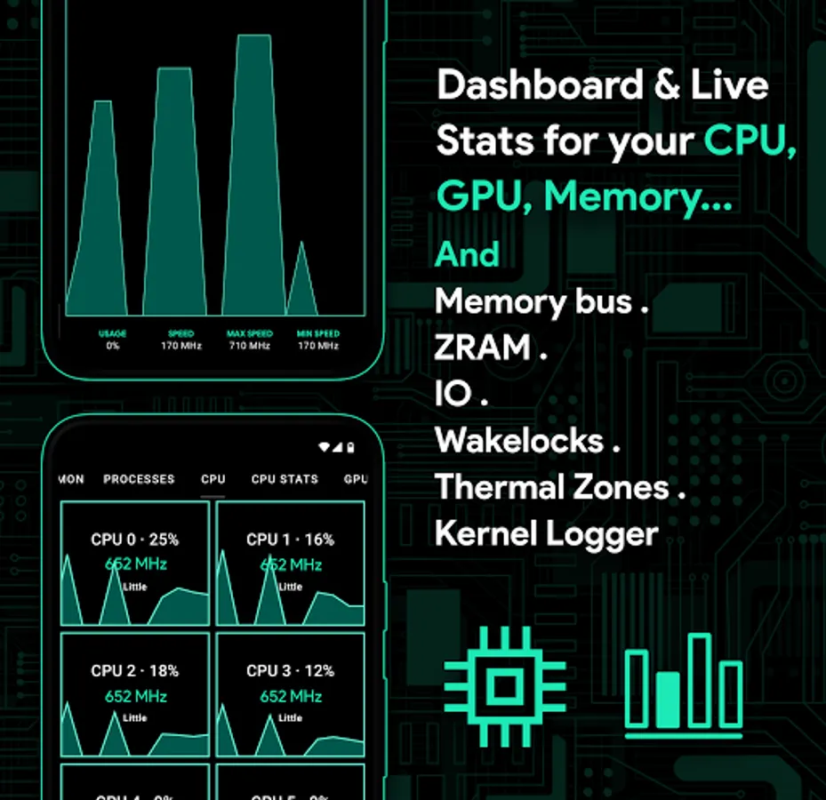 ⭐️ System Health with a beautiful UI, useful real-time CPU/GPU/RAM/ZRAM/DDR BUS/IO/THERMAL ZONES/WAKELOCKS usage and comprehensive CPU frequencies usage with support for clustered devices;