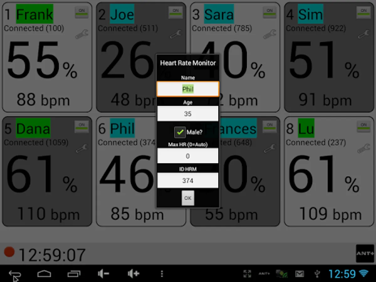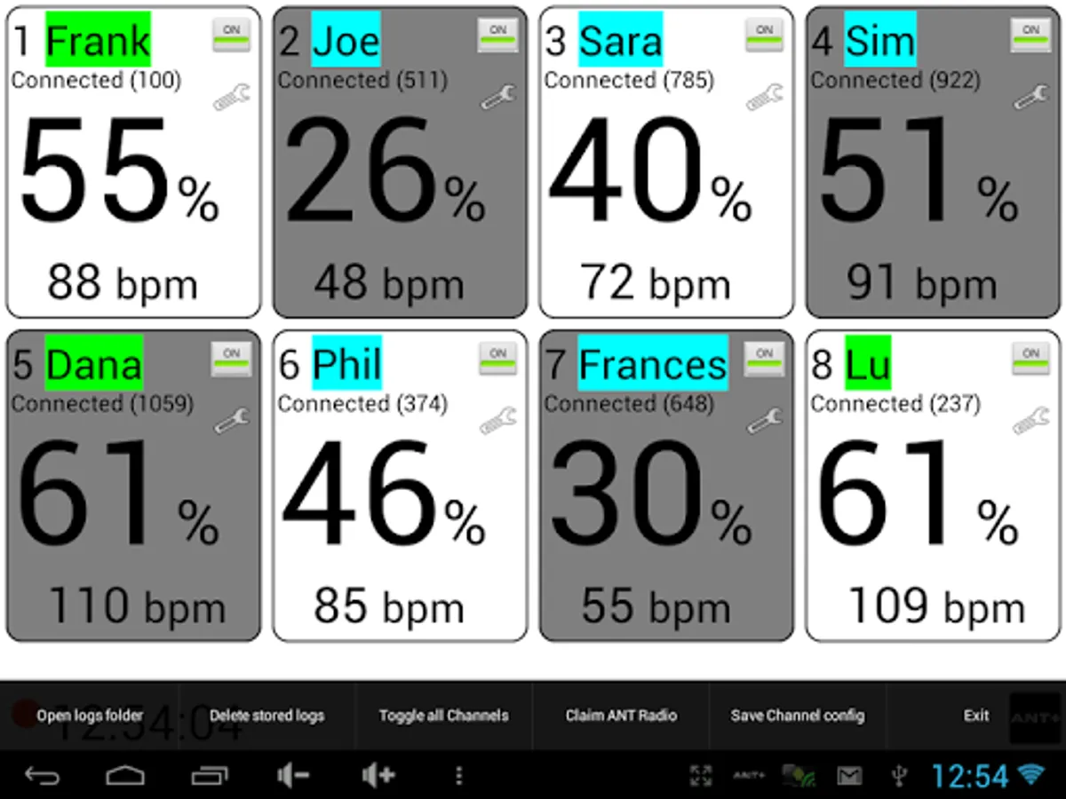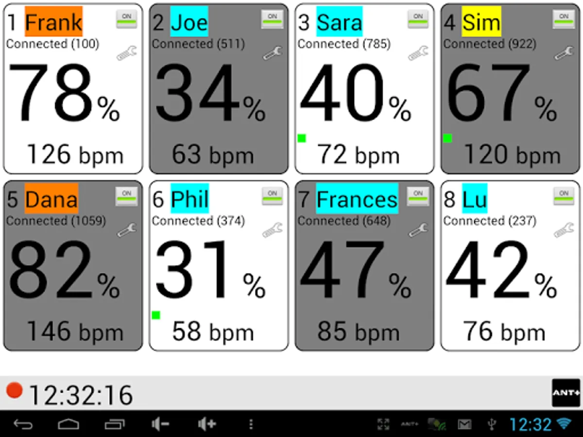 Simultaneously display multiple Heart Rate Monitor (HRM) belts values using the ANT+™ protocol. Useful for Cardio-Fitness, Spinning class and Gym fitness workouts, to easily display and control the training activity of up to 8 persons. HR reading of each trainee is displayed as relative % and absolute value.