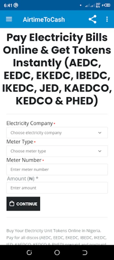 ELECTRICITY: Pay and get your token instantly via SMS, email, order status and API. We offer all discos postpaid & prepaid including AEDC, EEDC, EKEDC, IBEDC, IKEDC, JED, KAEDCO, KEDCO & PHED etc.