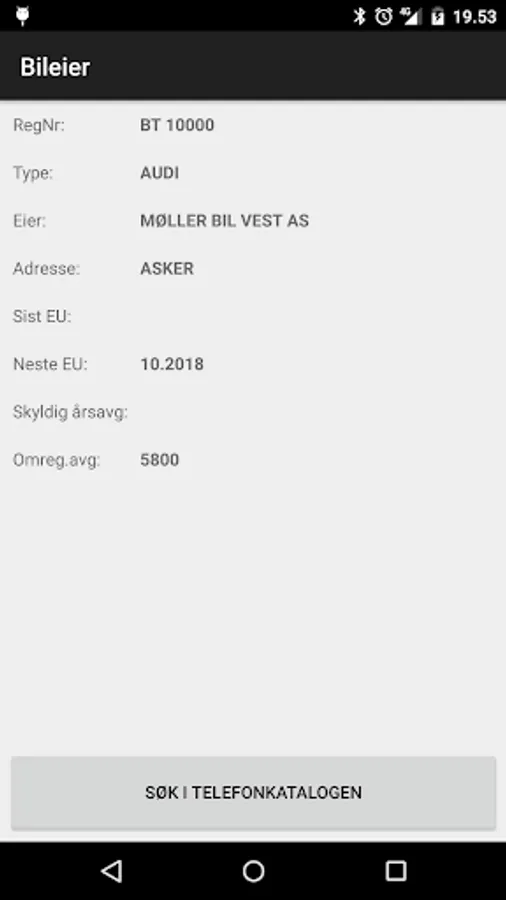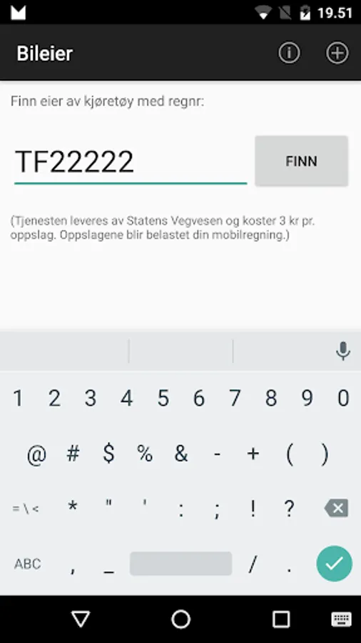 The service to locate car owner on regNo supplied by NPRA and costs 3 kr pr. lookups. The spreads charged to your mobile bill. Works only on vehicles from Norway.