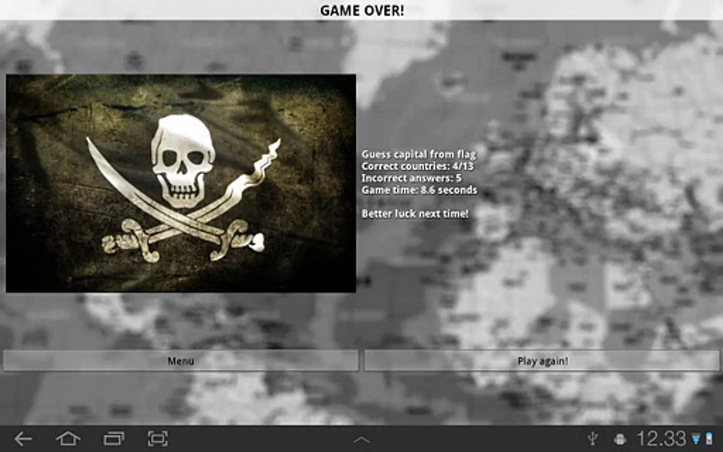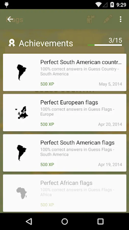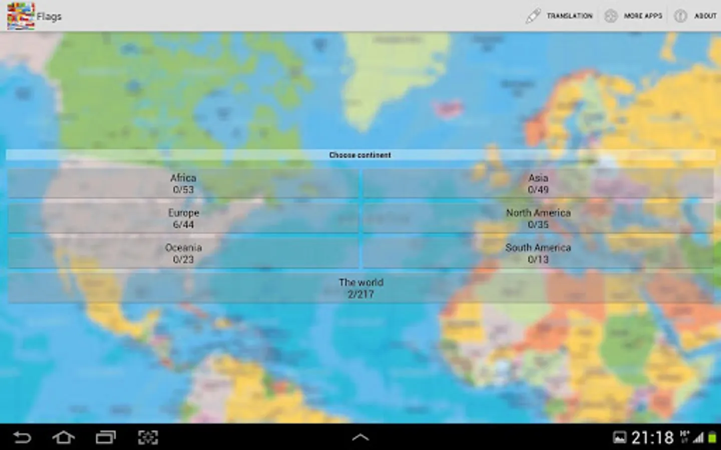 The app keeps track of your progress in each game mode and within each continent (Africa, Asia, Europe, North/South-America and Oceania).