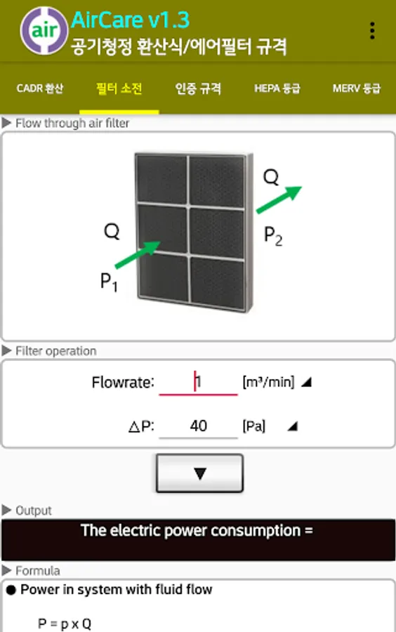 2) Calculation of shaft power applied to the fan according to the pressure difference between the front and rear ends of the filter and the amount of passing air