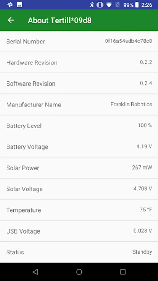 This app uses Bluetooth to connect to the robot and allows you to see realtime data and update Tertill's firmware.