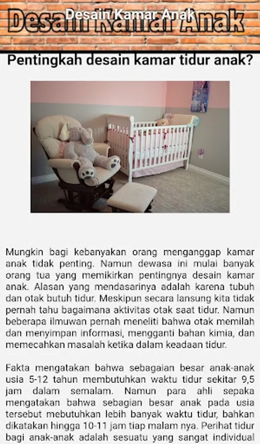 In this application we also provide tips on designing a child's bedroom so that your child's bedroom becomes more beautiful, more comfortable and in accordance with the wishes of your child. The application of this Child Room Design Idea truly inspires the design of a modern, minimalist and comfortable children's room.