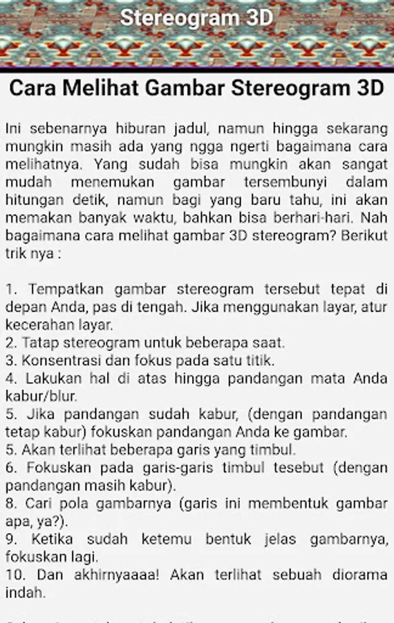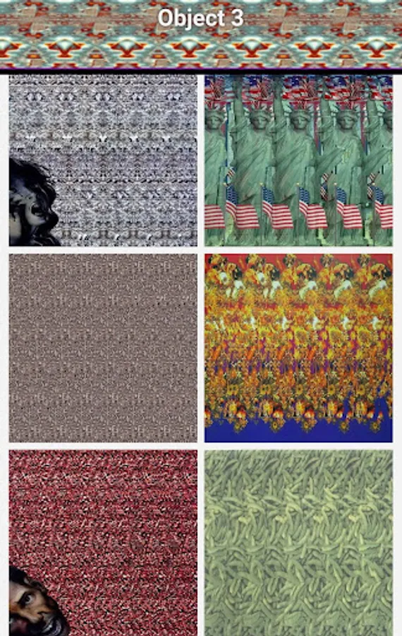 In this application you can see various 3D stereogram images in various unique and interesting shapes. You can play with your friends to guess what pictures are found. As a note you can adjust the screen brightness according to the comfort of your eyes, as well as to clarify the image. Techniques for viewing 3D stereograms can be read in the articles in this application.