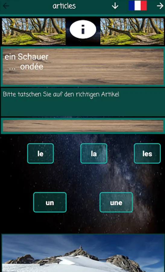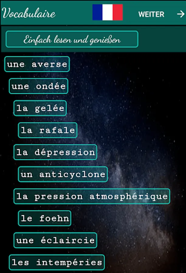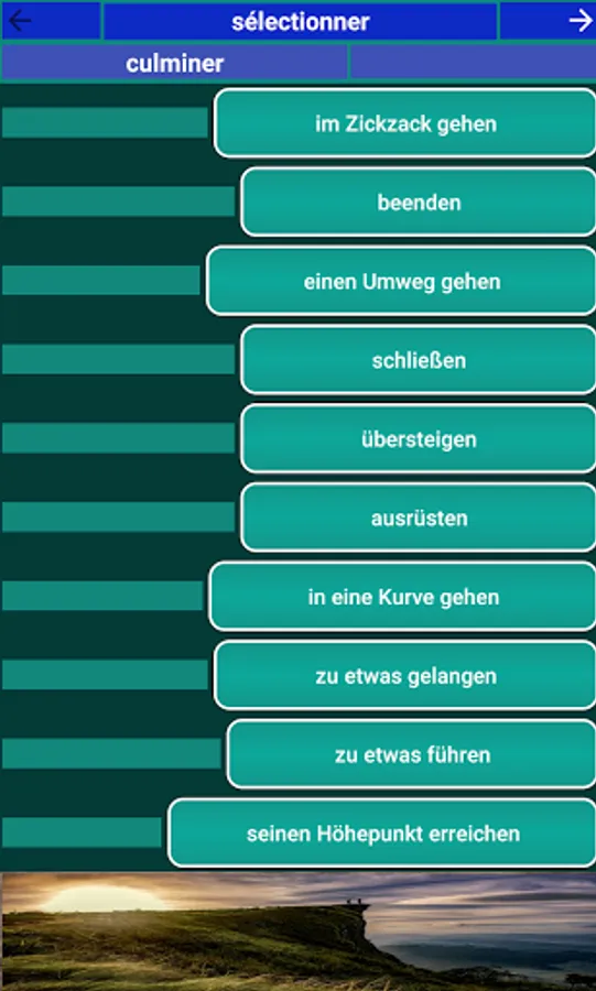 In this app you will find all the relevant vocabulary to crack even the most complicated hiking guide. The whole thing in a sophisticated design, provided with numerous exercises and tests that will make learning easier for you. If you feel like it, you can take a final test at the end.